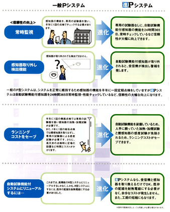 P型火災受信機が、R波の高機能を手にいれました。P型では国内で初めて感知器などの常時監視や自動火災試験などの週間試験ができる自動試験機能を装備。システムの信頼性を高めるとともに、点検コストの低減を実現しました。しかも、既存の配線をそのまま使用できるためリニューアルもいたってスムーズ。信頼性が高い、点検コストを抑えられる、導入しやすい。これがノーミの考える新世代のP型、進Pです。