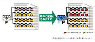 自動試験機能付システムにリニューアルする場合、これまではR型システムを選択するしかなく、その導入に当たっては、感知器の配線を耐熱伝染にする必要がありました。進Pシステムでは、耐熱電線が不要で既存の配線をそのまま使用できるため、余分なコストが発生せず、工期の短縮も可能。受信機と感知器を交換するだけで、より信頼性の高い自動試験機能付システムにグレードアップできます。